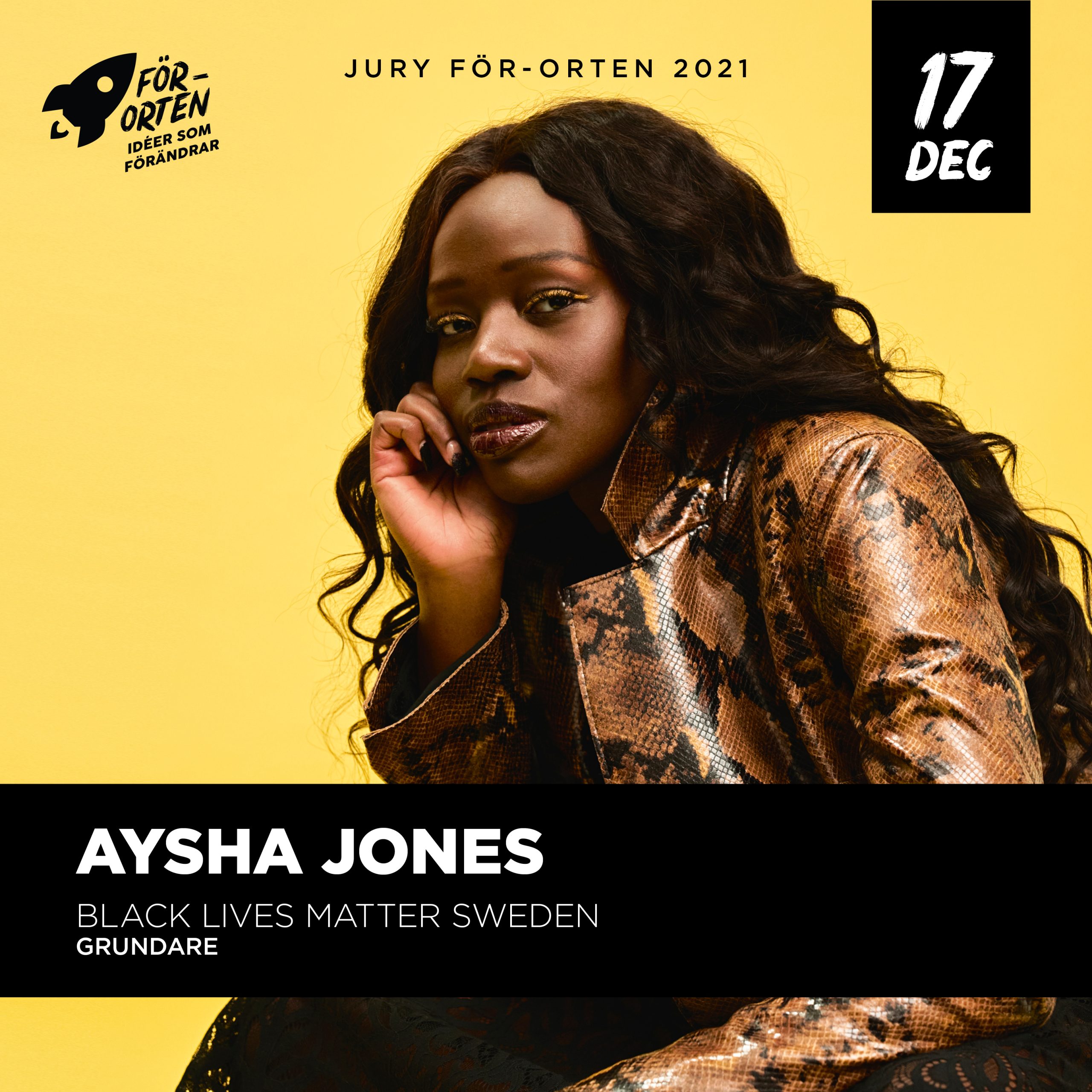 Aysha Jones är grundaren av Black Lives Matter Sweden och en banbrytare inom mode- och skönhetsindustrin. Hon är VD för By Aysha Jones AB, belönad för både sitt entreprenörskap och sin aktivism och bloggare på en av Sveriges största tidningar.
